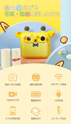 【子供も大人も楽しめる逸品】 日々の出来事の記録として写真手帳をつくったり、または子どもにカメラを持たせると、自分の興味のあるものと、おもしろいと思ったものを撮影したり、好奇心と集中力を養うにぴったりなプレゼントです!クリスマス/新年/誕生日/入園/入学/卒業祝いなどのギフト・プレゼントとして、絶対に喜ばれる贈り物! 商品仕様 ●画素:前後1200万 写真解像度:4608 × 3456 ●ビデオ:最大1080P HD ビデオ解像度:1920 × 1080 ●製品サイズ:90*80*40mm ●包装箱寸法:128*90*70mm ●本体重量:約175g ●バッテリー:1500mAh ●充電時間:2-3時間 ●仕様対象:3歳以上のお子様 ●USBポート:マイクロUSB 2.0 ●スクリーンタイプ:2.4インチIPSカラースクリーン ●充電規格:DC5V 1A ●連写機能:あり ●マイク:内蔵あり ●言語:多国言語(日本語含め) ●セット内容:カメラ本体、シール感熱紙、通常感熱紙、2WAYストラップ、スッテカー、32GB Micro SDカード、USB充電ケーブル、カラーペン6本、日本語取扱説明書 ★