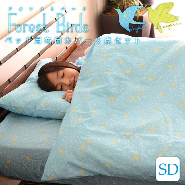 ベッド用布団カバー3点セット「フォレストバード」 セミダブルサイズセット内容点数サイズ/中わた量中身素材/生地素材掛け布団カバー1約170×210cmポリエステル65%、綿35%180cmファスナー開閉式、8ヶ所ヒモ付き ※こちらのサイズは生地幅より大きい幅になるため、生地のつなぎが入ります。