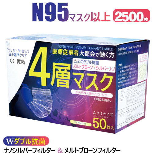 4層 マスク 医療用 2500枚 ナノシルバー メルトブローン 【最上位クラス】 静菌効果が凄い 耳が痛くならない サージカル N95 と同等 ag 銀イオン 高品質 送料無料 使い捨て N95マスク n95 お徳用 大容量 【1箱50枚入×50箱】 四層マスク おすすめ 業務用 FDA CE 認証