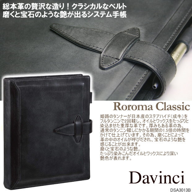 磨くと宝石のような艶がでるクラシックなデザインのシステム手帳 革 リフィルをたくさん綴じたい方におすすめのシステム手帳 大口径30mmリング 商品名 Davinci GRANDE ダ・ヴィンチ グランデ ロロマクラシック システム手帳 A5サイズ 品番 DSA3013B ブラック サイズ 約)縦234×横192×厚さ45mm 重さ:約)640g 材質 ヌメ革(牛革) リフィル 縦210×横148mm (A5・デスクサイズ 6穴) 仕様 リング内径-約30mm(リフィルを最大265枚収納可能) 可動式ペンホルダー、高級ギフトパッケージ入り リフィルセット付(フリーマンスリー、ノート、プロジェクト他) メーカー 株式会社 レイメイ藤井 raymay たっぷりと染み込んだオイルとワックスにより深い艶色が現れる本革製システム手帳。