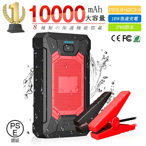 ジャンプスターター 12V車用エンジンスターター 10000mAh ガソリン車・ディーゼル車に通用 モーターバイクに対応 QC 3.0 18W急速充電 ポータブル充電器 LED緊急ライト搭載 SOSストロボライト ヘルプ信号 防水 PSE認証済み ゆうパケット 送料無料