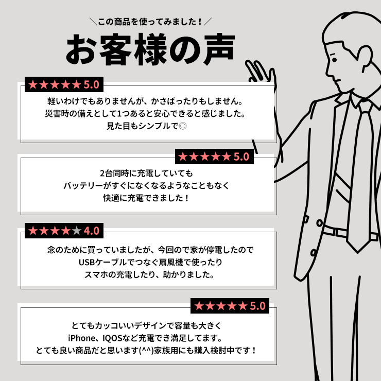内蔵バッテリー リチウムイオンバッテリー バッテリー容量 10400mAh 38.4Wh 入力電圧/電流 5V 2A 出力電圧/電流 5V 2.4A(SmartIC)/5V 1A 使用回数 蓄電・充電を1回としておよそ500回 重量 約272g サイズ 約138×62×22mm 満充電までの必要時間 2A出力のACアダプタ(別売り):およそ5時間半 付属品 充電器本体、蓄電用microUSBケーブル(30cm)、日本語取扱説明書 保証期間 お買い上げより180日間 【2016年2月登録】 商品名:モバイルバッテリー 大容量 持ち運び充電器 iPhone 8 急速充電 2.4A アイフォン スマホ ポータブル 充電器 携帯充電器 スマホバッテリー 10000mAh アンドロイド android スマホ充電器 送料無料 軽量 PSE PSE認証 安全 iphone8 iphonexr iphone7 ipad galaxys9 薄型 薄 急速充電 車 コンパクト スイッチ 小さい ドラクエウォーク 機内持ち込み 飛行機 おすすめ 人気 防災対策 台風対策 停電対策 対応機種: ipod iphone8 iphone7 iphonexr iphone Sony Xperia Sharp AQUOS Samsung Galaxy arrows HUAWEI ASUS Zenfone HTC LG Nexus Microsoft Xperia Ace AQUOS R3 Galaxy S10 Galaxy S10 arrows Be3 Xperia 1 LG style2 HUAWEI P30 Pro Google Pixel ギャラクシー 防災セット 防災グッズ 防災 備蓄 サバイバルグッズ ドラクエウォーク グッズ サブバッテリー バッテリー モバイルバッテリー iPhone アンドロイド android 大容量 iPhone8 急速充電 スマホ 充電器 急速 2.4A 2.1A アイフォン8 必要なもの 自動判別 10000mah 2台同時充電 おしゃれ 機内持ち込み ケーブル コンセント/li> コンパクト aquos sense2 switch タイプC AC ACアダプタ メーカー希望小売価格はメーカーサイトに基づいて掲載しています 商品名 Smith10400 内蔵バッテリー リチウムイオンバッテリー 容量 10400mAh 定格入力 5V 2A 定格出力 5V 2.4A(SmartIC)/5V 1A 使用回数 充電蓄電を1回として約500回 重量 約272g サイズ 約138*62*22mm 付属品 バッテリー本体、蓄電用microUSBケーブル フル蓄電までの時間 5時間30分(2.1A出力ACアダプタ使用時) 保証期間 お買い上げより6ヶ月間 ※蓄電時は定格2.0A以上のACアダプダの利用を推奨しております。